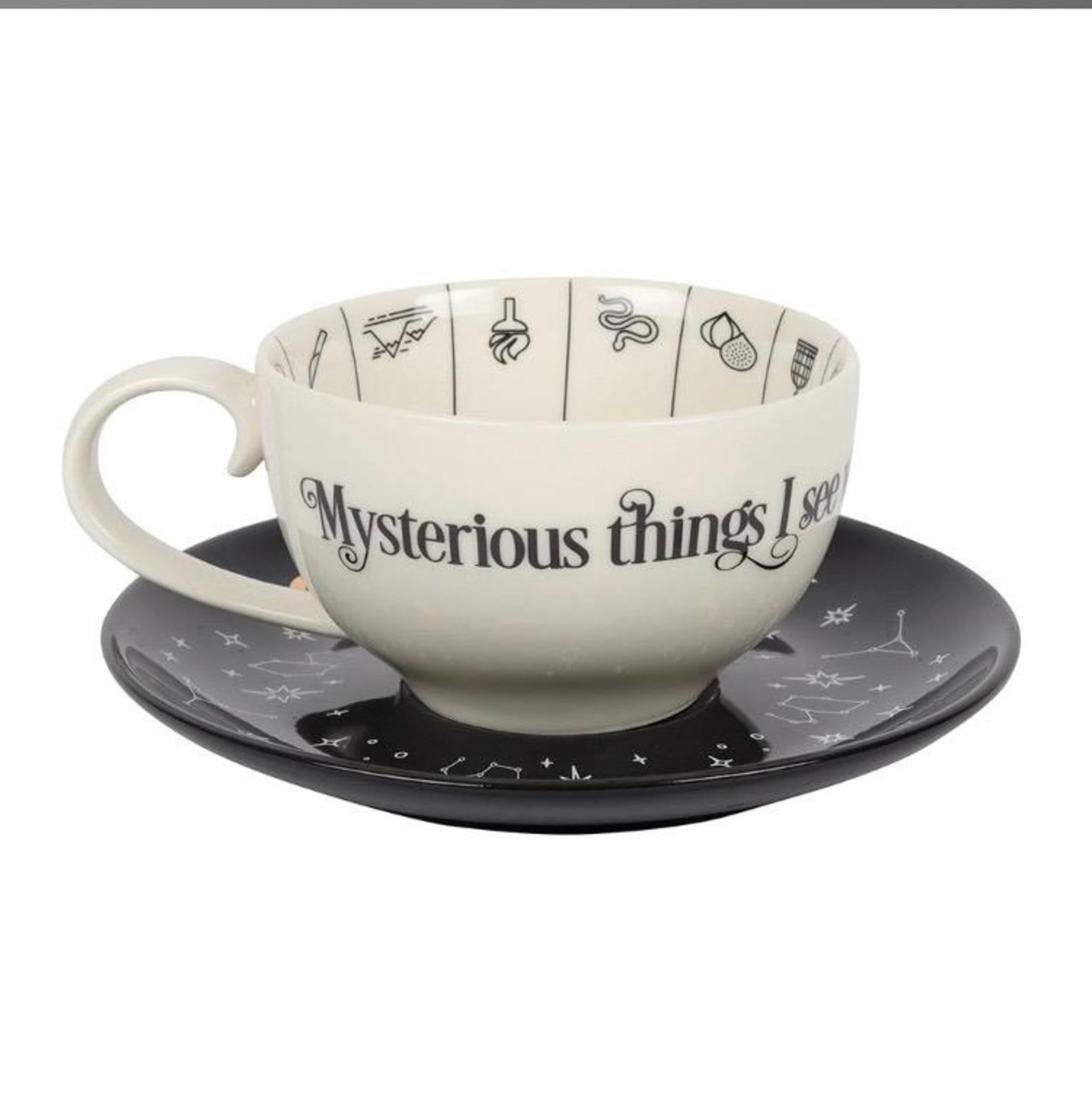A stunning and unique Tea cup which can be used for reading tea leaves. The cup features a variety of fortune telling and astrological symbols accented with gold foil with a contrasting black saucer. The text reads “Mysterious things I see when telling fortunes in tea “ Truly a piece to be treasured and would make a wonderful gift. Boxed and FREE POSTAGE