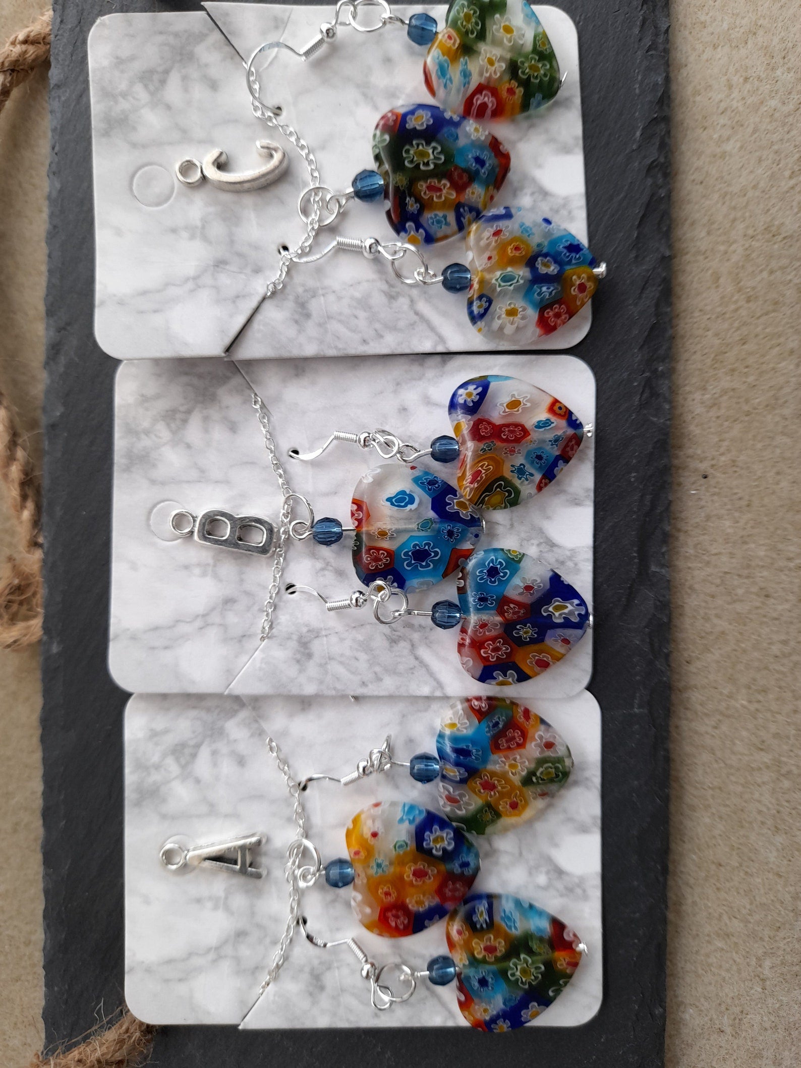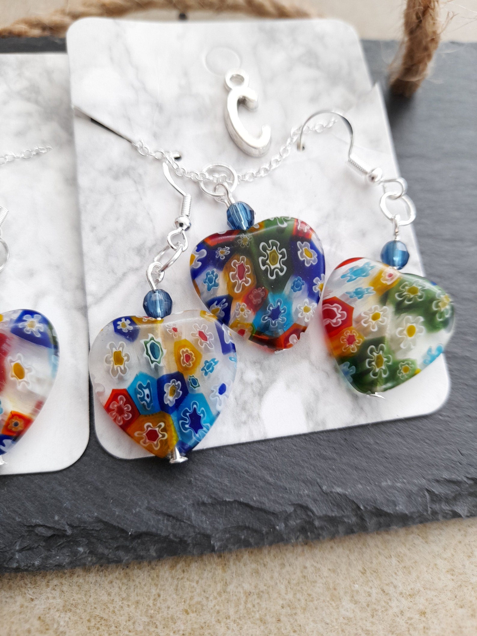 Unique and beautiful Necklace and earrings set. The glass hearts are handmade and no single one will be the same. They measure 3/4 inch across and are 1 inch high. The Necklace chain and earring hoops are marked 925. Would make a beautiful gift if you could bear to part with them. They come gift boxed and FREE POSTAGE