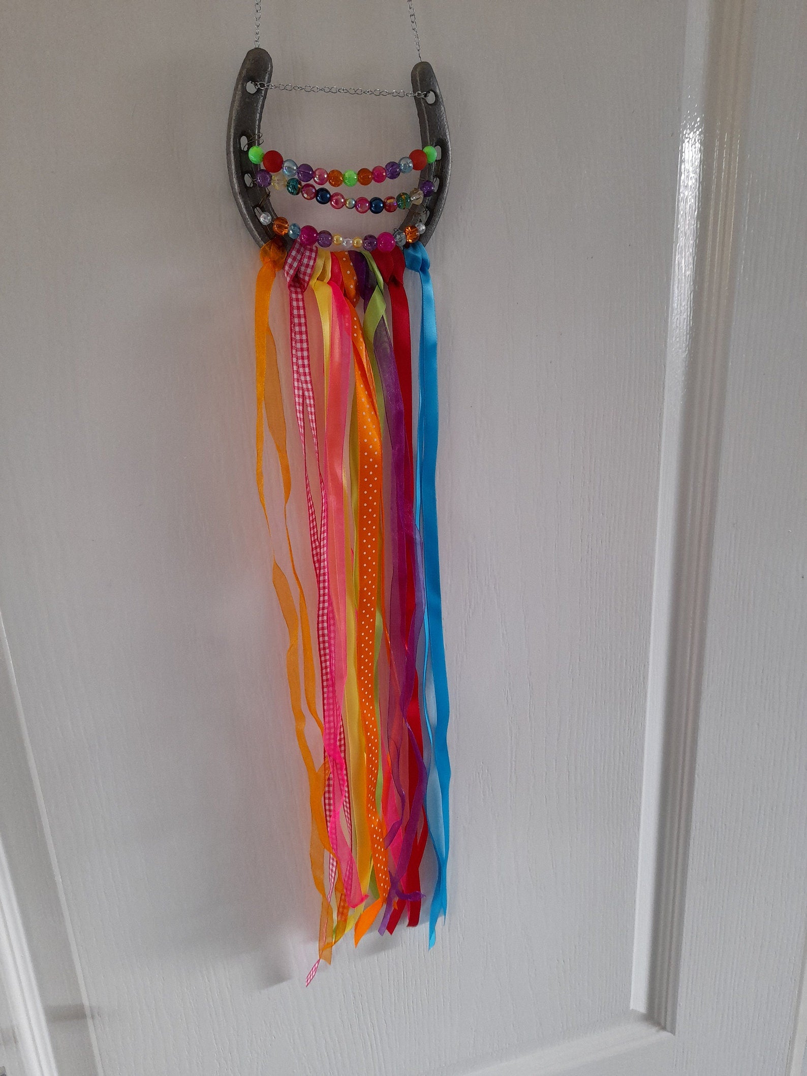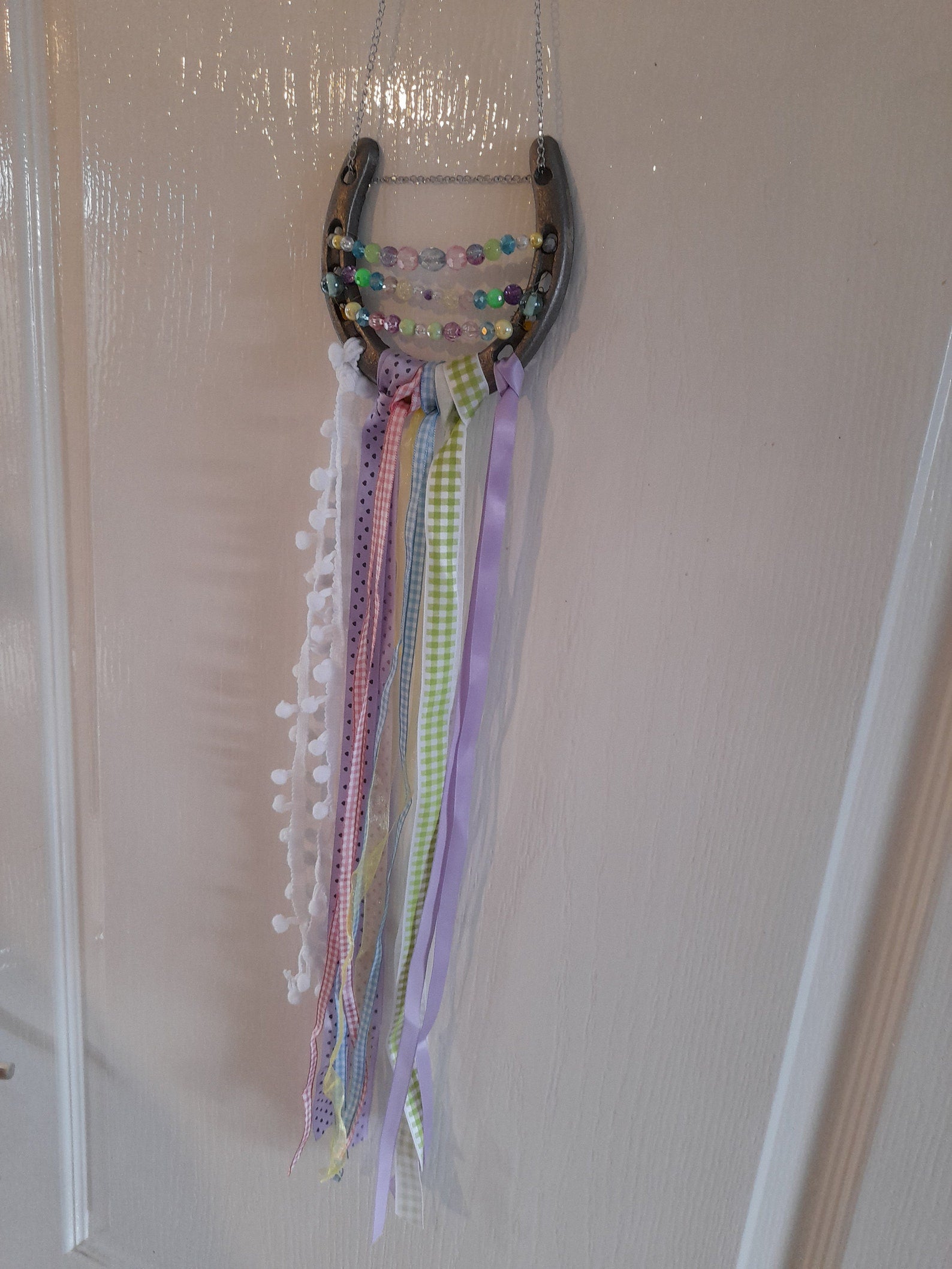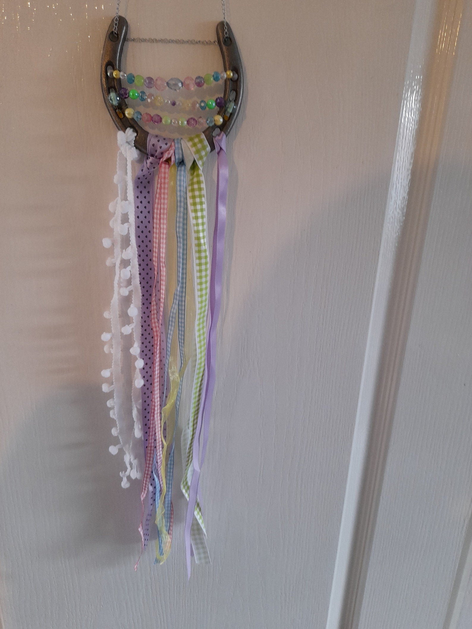 Beautiful beaded horsehoes with ribbons, these are handmade and unique. If you require a different colour scheme please message me. Offer is one horseshoe hanging with FREE POSTAGE