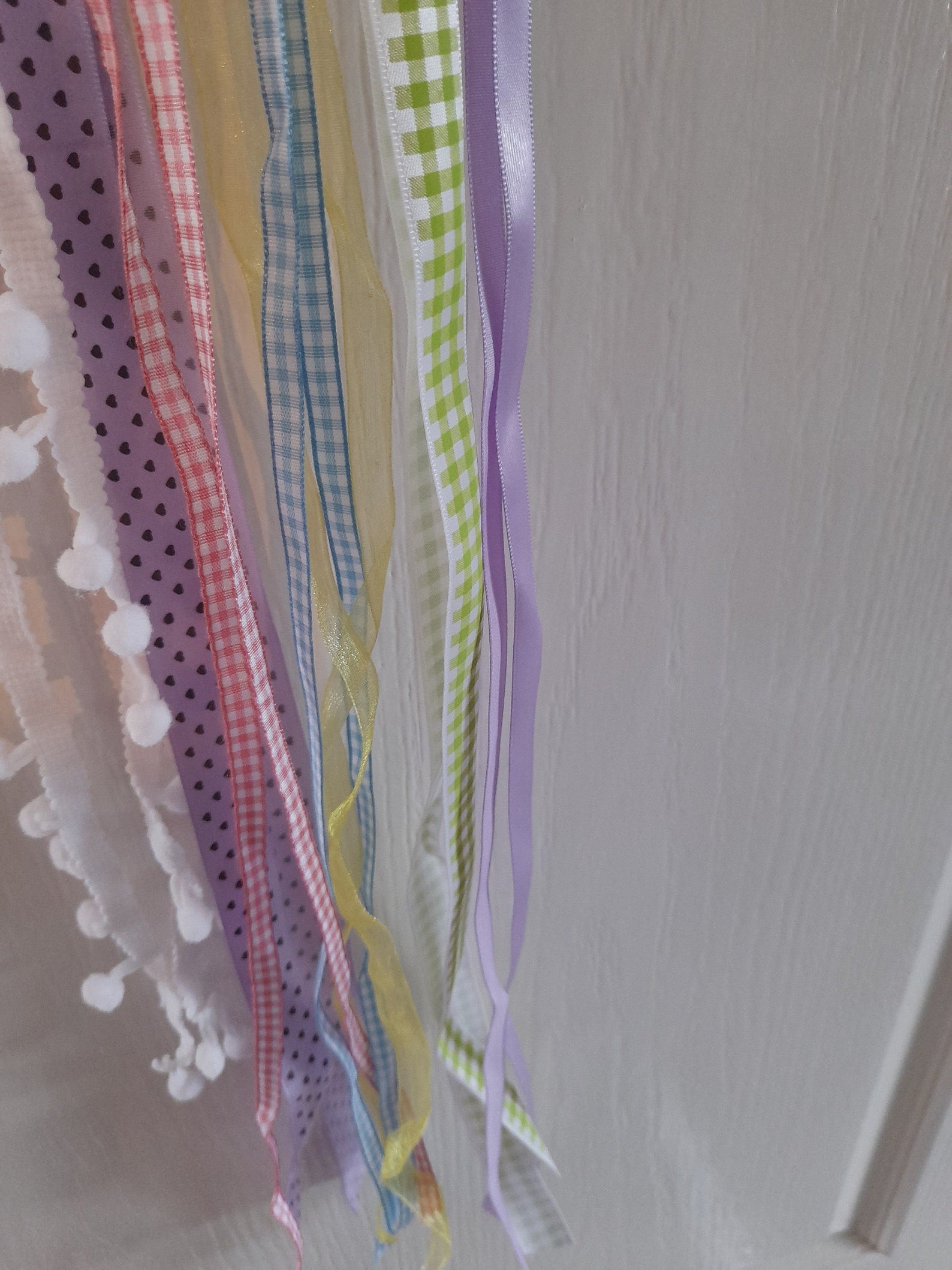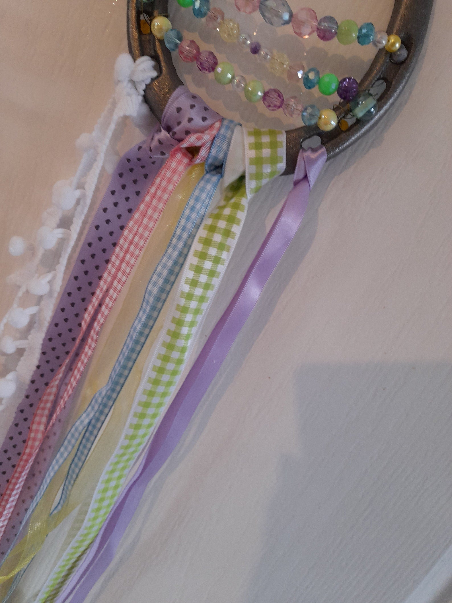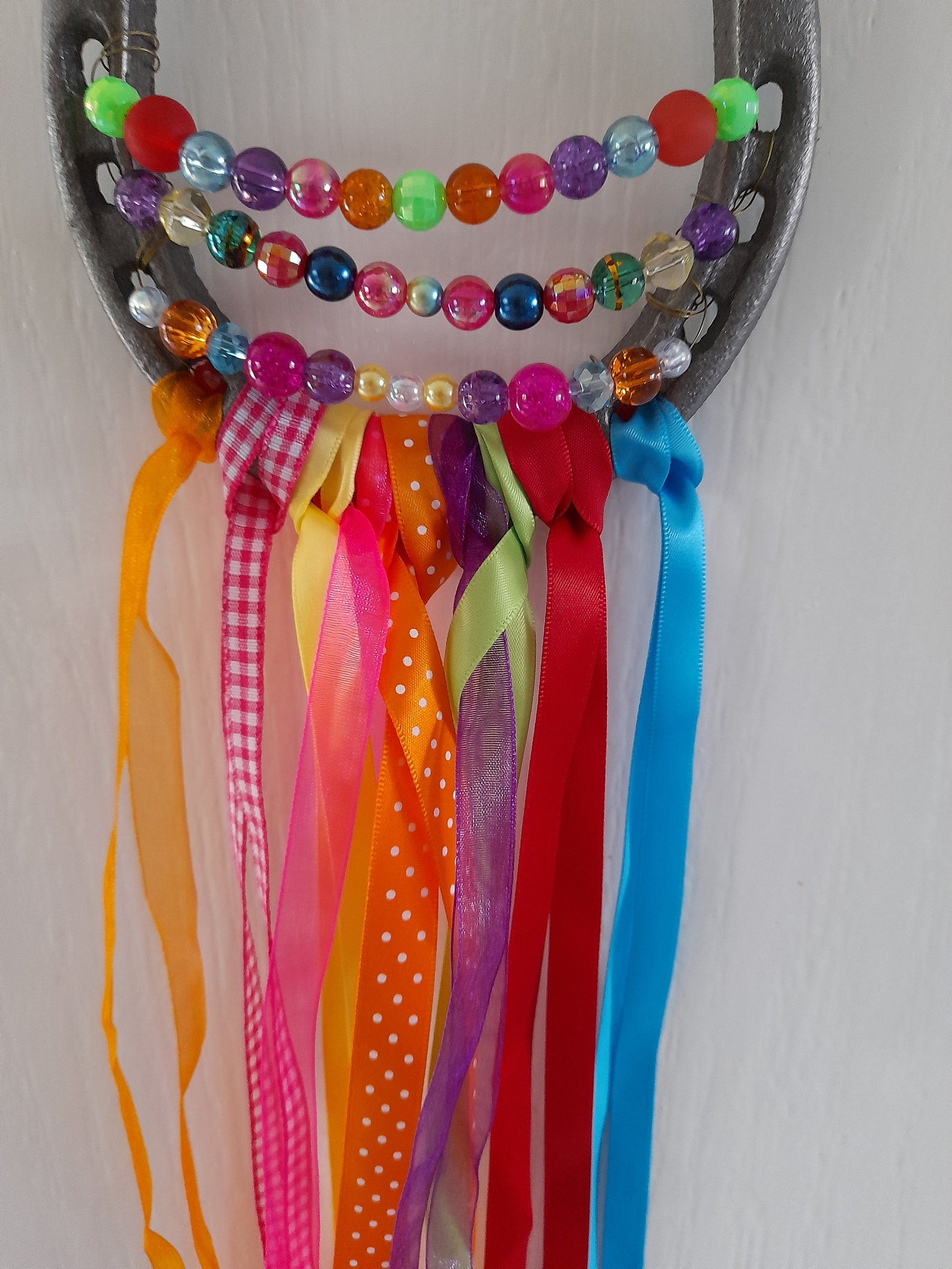 Beautiful beaded horsehoes with ribbons, these are handmade and unique. If you require a different colour scheme please message me. Offer is one horseshoe hanging with FREE POSTAGE