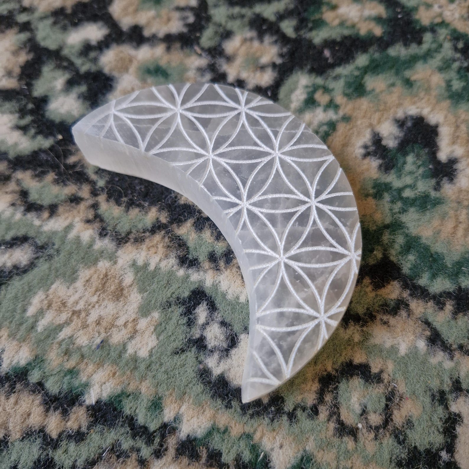 Selenite Crescent Moon with Mandala Geometric Engraving, spiritual, new age, crystals, witchy, pagan