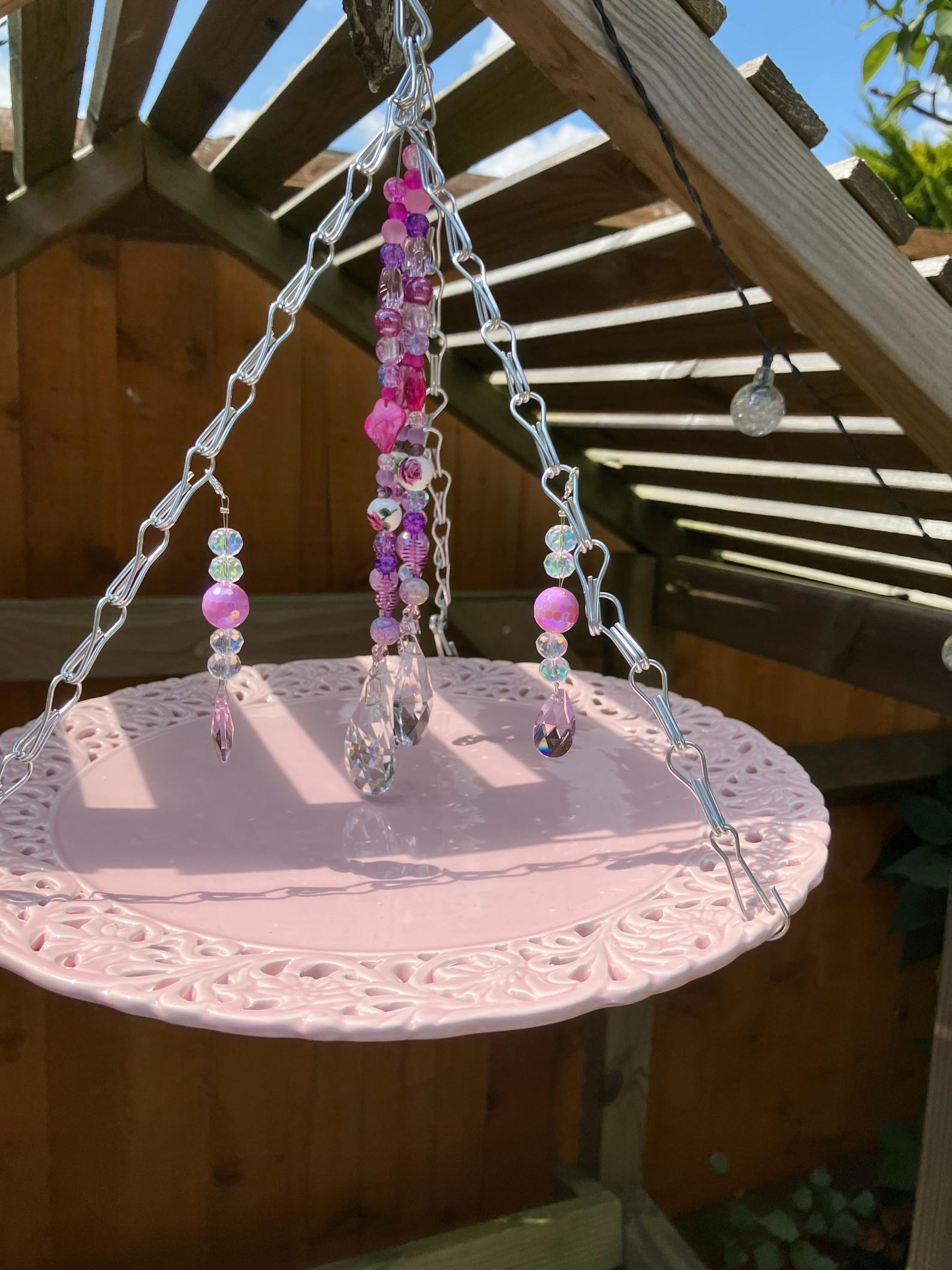 A beautiful one off bird feeder/ hanging tray/ decora. The diameter is 29cm and the height is approximately 29 centimetres. A totally unique piece made with vintage China a one off . Free postage